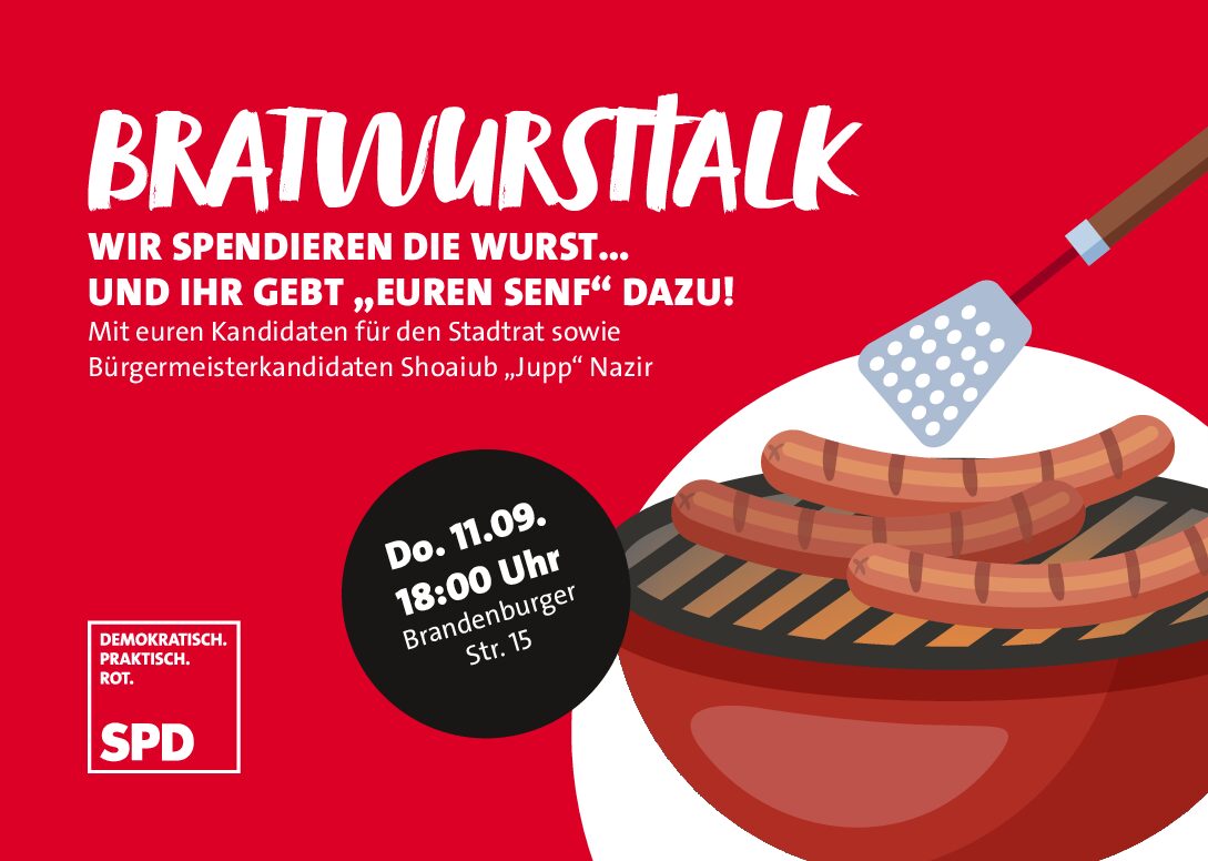 Am 11. September findet unsere dritte Auflage zum Bratwurst Talk statt. Auf dem Geländer der Brandenburgerstraße 15 läd unser Bürgermeisterkandidat Shoaiub „Jupp“ Nazir mit den jeweiligen Wahlkreiskandidaten Interessierte Bürger ein. In gemütlicher Atmosphäre, bei Bratwurst und kalten Getränken, können die Mitbürger ihren Senf dazu geben. Im Mittelpunkt der Gesprächs stehen